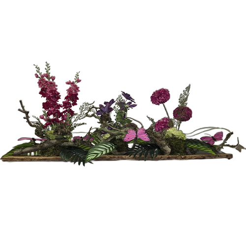 Alsof het zo uit een sprookjesbos is komen aanwaaien. Dit bloemenplateau is allesbehalve standaard. Wildwoods is een ruige, romantische mix van fuchsia- en paarstinten, speels verweven tussen takken, tropisch groen en mosachtige texturen. De wilde bloemen lijken zo uit een verborgen woud geplukt te zijn en geven jouw setting een instant wow-effect.